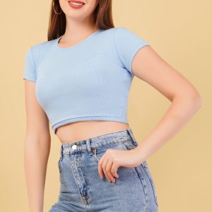 Ribbed Round Neck Fitted Crop Top for Women – Sky Blue