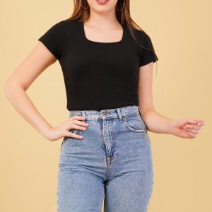 Ribbed Round Neck Fitted Crop Top for Women – Black