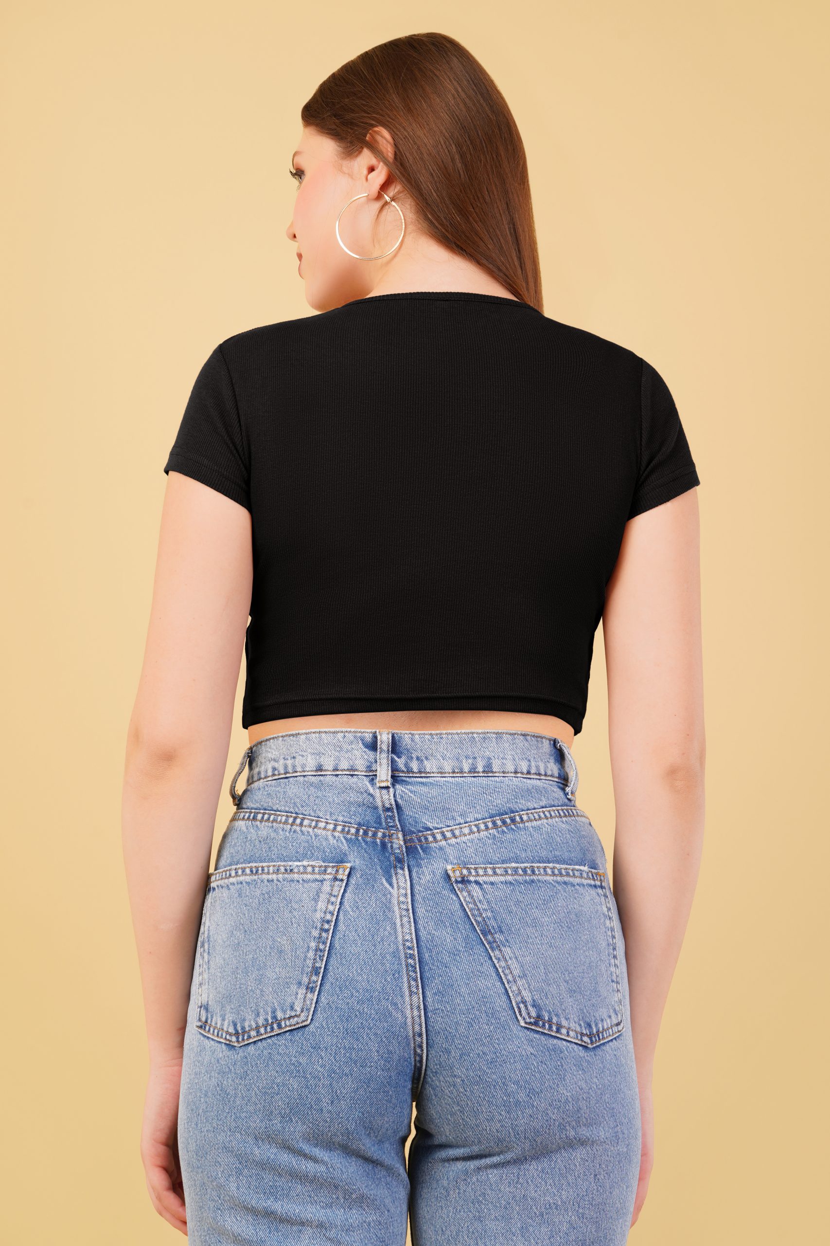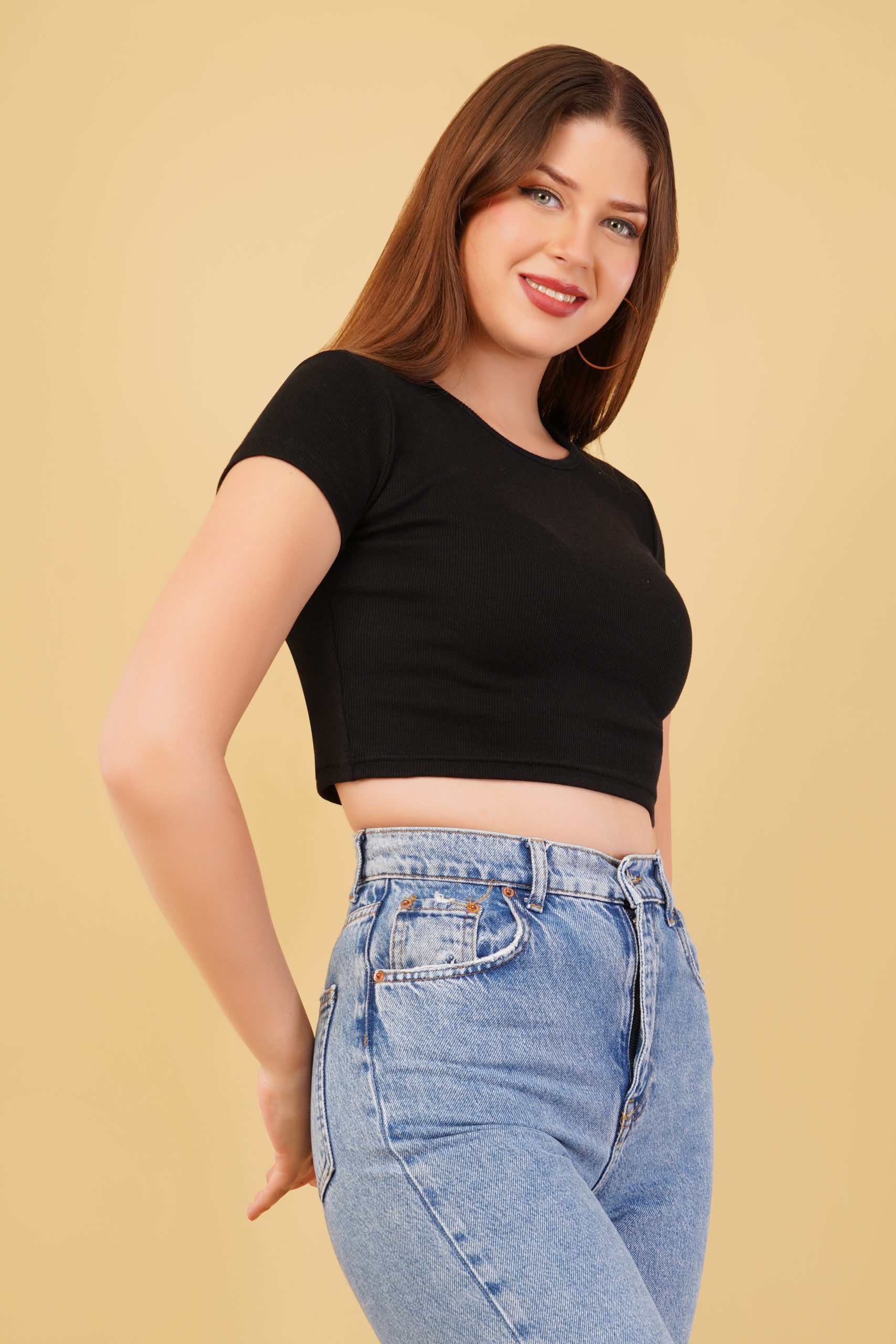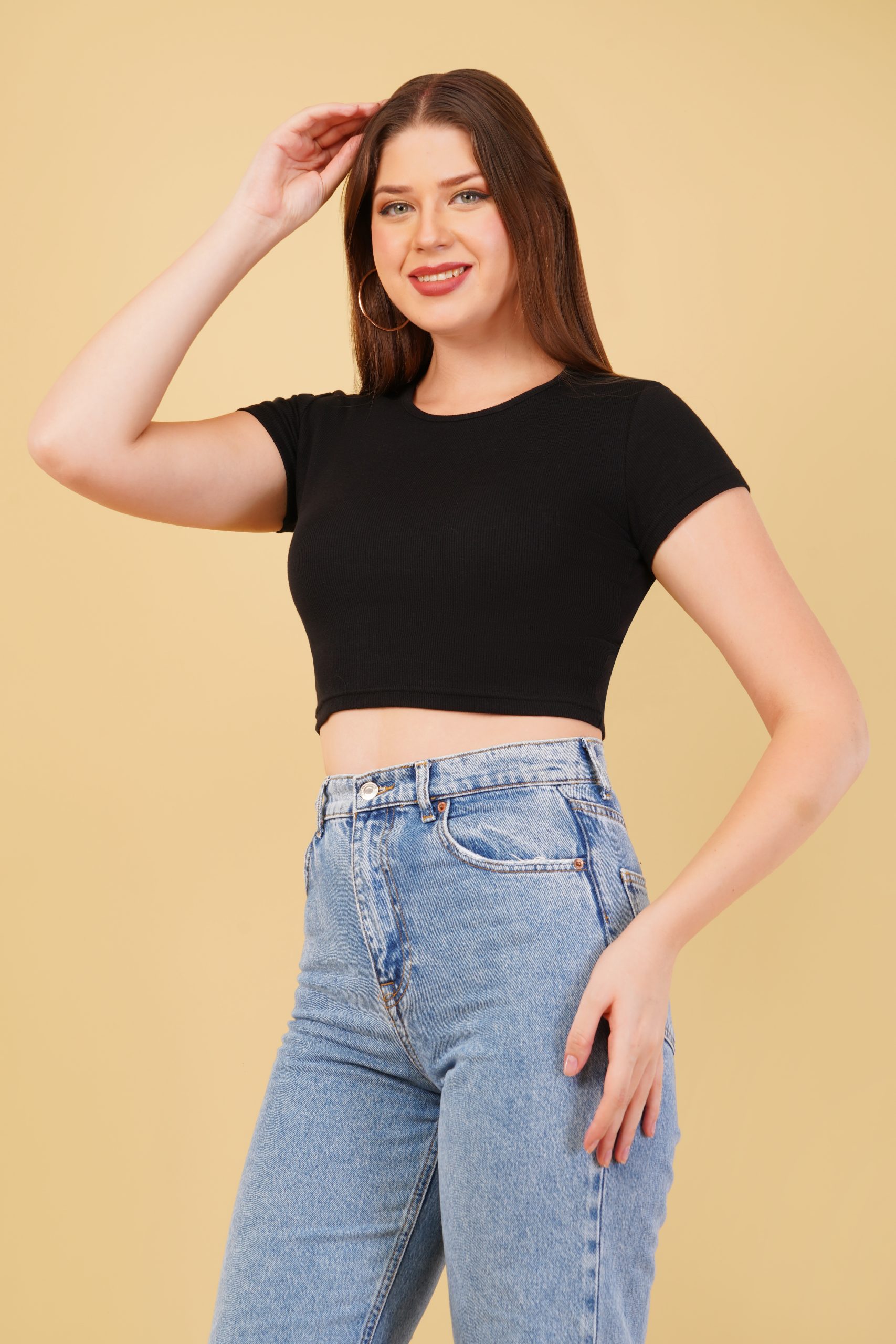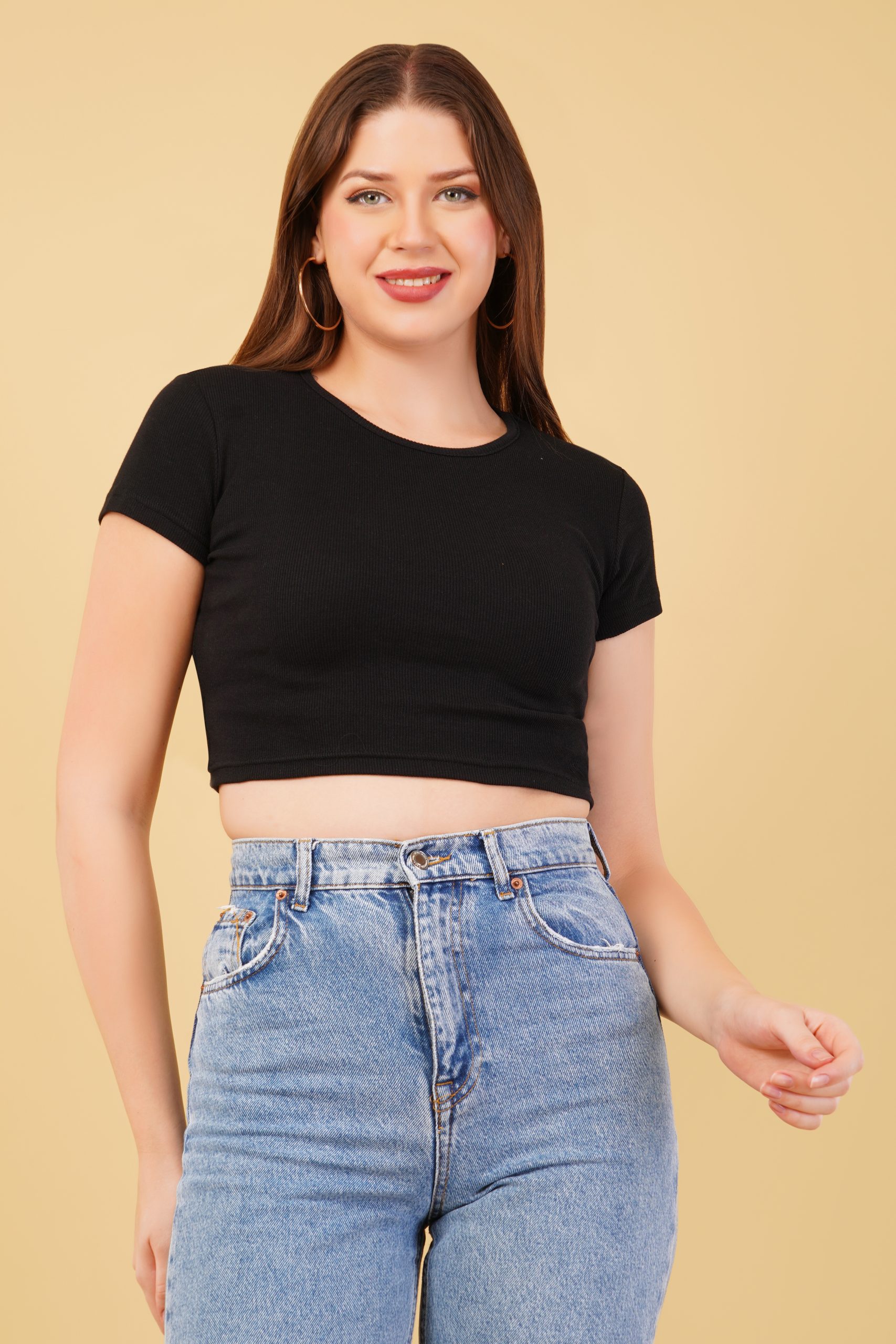 A perfect blend of elegance and comfort! This Ribbed Round Neck Fitted Crop Top for women features a sculpting fit that flatters your shape. Made from soft, stretchy cotton lycra fabric, this women ribbed crop top is ideal for both casual and dressy looks.