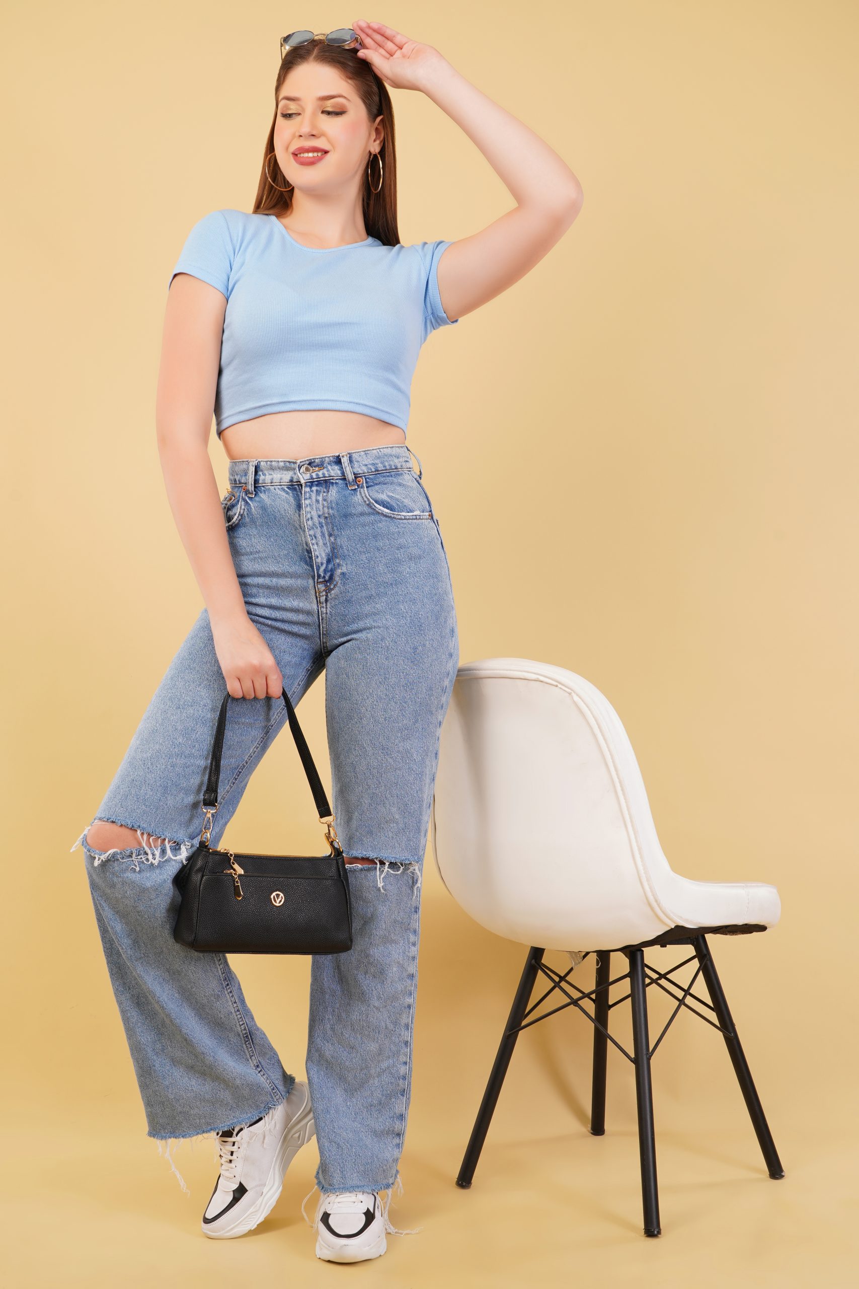 The Ribbed Round Neck Fitted Crop Top is available in three colours Sky Blue, Brown and Black.