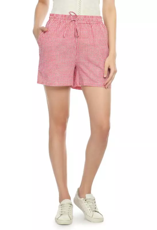Cotton Checked Lounge Shorts for Women – Soft Breathable Fabric, 2 Side Pockets, Adjustable Drawstring Waist – Casual & Comfy Loungewear (Pink)