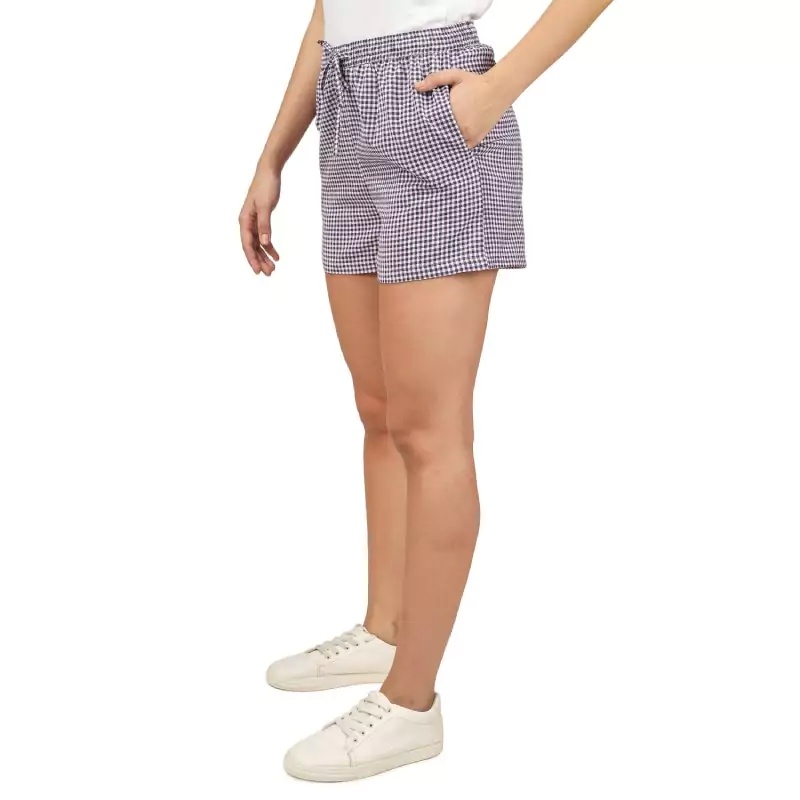 Cotton Checked Lounge Shorts for Women – Soft Breathable Fabric, 2 Side Pockets, Adjustable Drawstring Waist – Casual & Comfy Loungewear (Purple)